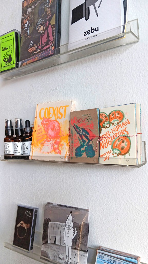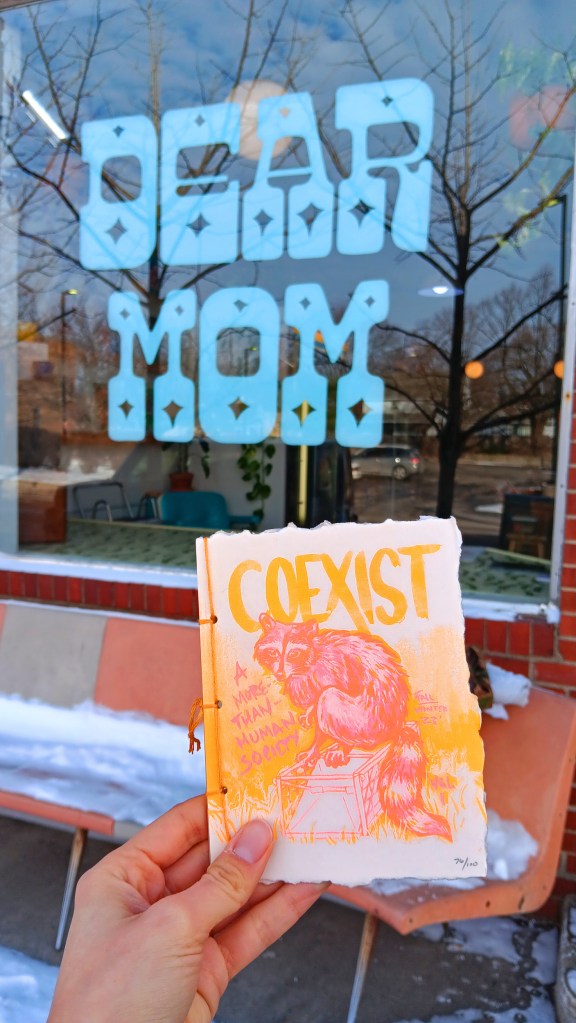 Last but not least, you can now find my zines at Dear Mom in Indianapolis, Indiana! Liz has an awesome curated selection of local and deep cut art, zines, records, and food. Now there are cute wrapped bundles of the Non-Human Neighbors zine series (vol 6-10) and copies of A More-Than-Human Society vol 1. So if you miss the zine fest, I would definitely drop by the shop to pick up one of the last remaining copies of these limited-edition risograph prints.