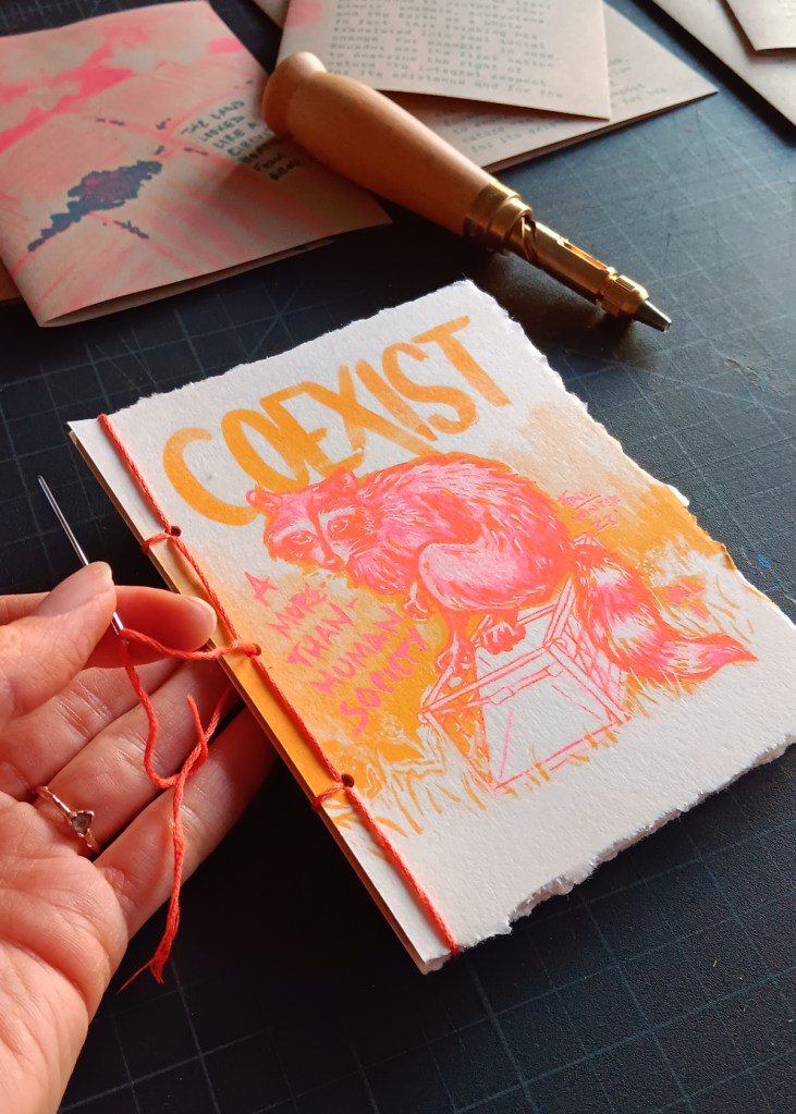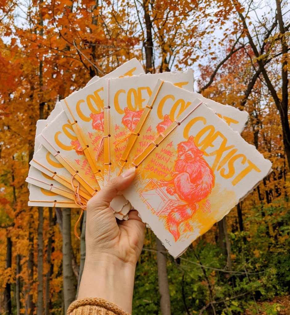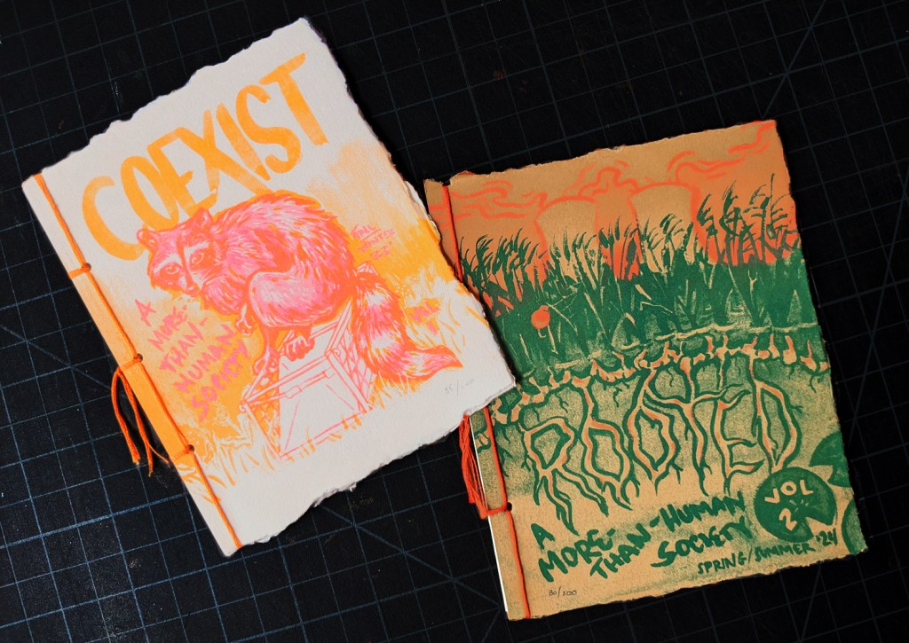 Some notable features include Mark’s sociological essay on strategies for coexistence and my illustrated story about sabotaging live raccoon traps. The volume concludes with a “Coexistence Manifesto”. We enjoyed making it so much that we carried the format over into the second volume.