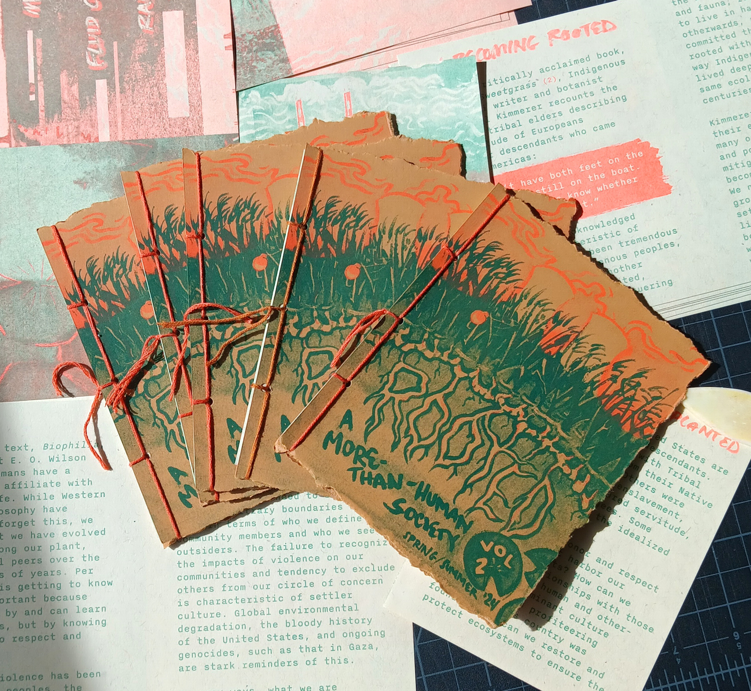 Each zine is assembled via Japanese stab binding and risograph-printed using plant based inks by Risolve Studio studio on recycled French Paper Co. stocks. If a reader is ready to move on from a zine, they can re-gift it or even safely burn it.